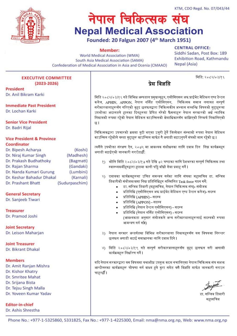 चिकित्सक संघको पहलमा सोमबार काठमाडौंमा बसेको संयुक्त बैठकले ऐनको विवादास्पद व्यवस्थाहरू हटाउन माग गर्दै चरणबद्ध आन्दोलनको घोषणा गरेको हो। बैठकमा नेपाल डेन्टल एसोसिएसन, नेपाल नर्सिङ संघ, औषधि उत्पादक संघ (एपोन), निजी अस्पतालहरूको संगठन (अफिन), निजी मेडिकल तथा डेन्टल कलेज संघलगायतका प्रतिनिधिहरूको उपस्थिति रहेको थियो।